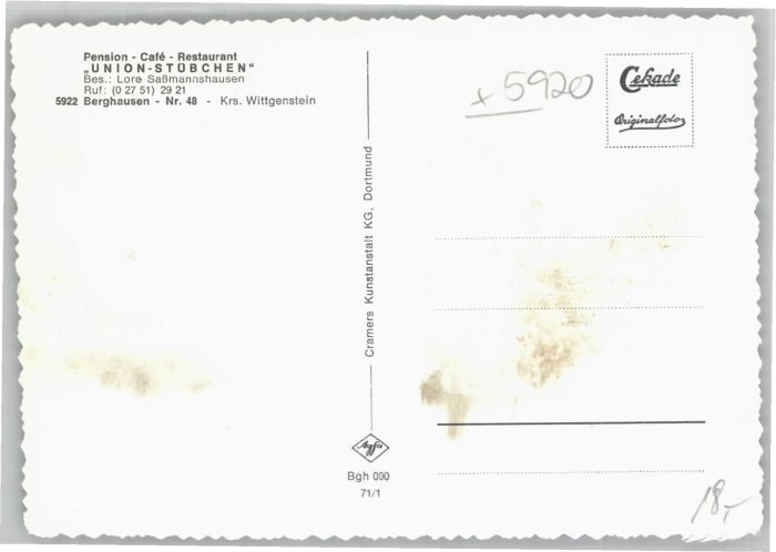 40676176 Berghausen Wittgenstein Pension Cafe Restaurant Union-Stübchen KatCode 11110005970004
