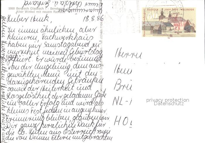 72303829 alte Postkarte Bergisch Gladbach Alter Winkel mit neuem Rathaus postalisch gelaufen Erhaltung siehe scans KatCode: 11110005378004