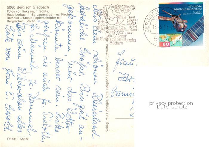 73271650 alte Postkarte Bergisch Gladbach Haus Lerbach Sankt Laurentius Kirche Rathaus Statue Papierschoepfer postalisch gelaufen Erhaltung siehe scans [KathaD81] KatCode: 11110005378004