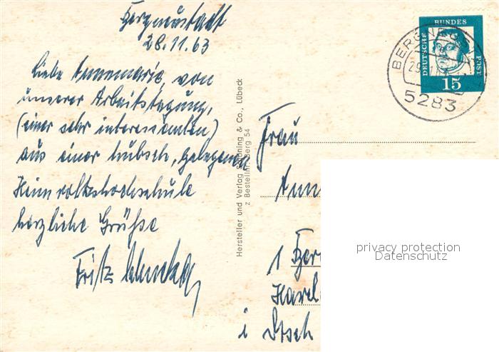 73741000 alte Postkarte Bergneustadt Panorama Feuerwehr Erholungsheim Aggertalsperre Altstadt mit ev Kirche Teilansicht Heimvolkshochschule Rathaus postalisch gelaufen Erhaltung siehe scans [WerneD78] KatCode: 11110005374004