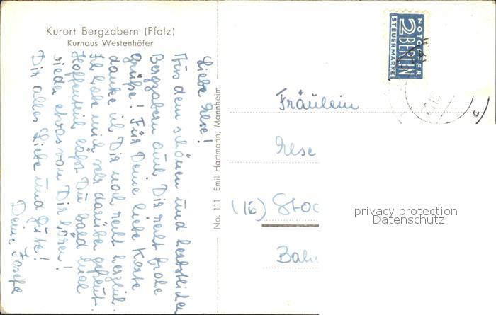 72096851 alte Postkarte Bergzabern Bad Kurhaus Westenhoefer postalisch gelaufen Erhaltung siehe scans KatCode: 11110007337005