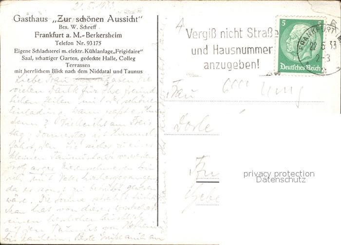 41585155 Berkersheim Gasthaus Zur Schoenen Aussicht postalisch gelaufen Erhaltung siehe scans Alte Ansichtskarte Postkarte alte Postkarte hz_L Katcode 11110006412000