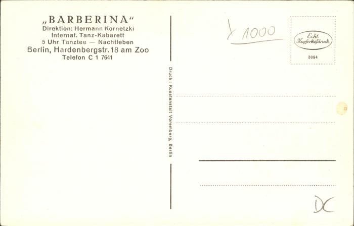 41403092 BERLIN CITY Barberina Tanzlokal Kabarett Hardenbergstrasse 18 postalisch nicht gelaufen gute Erhaltung KatCode: 11110011000000