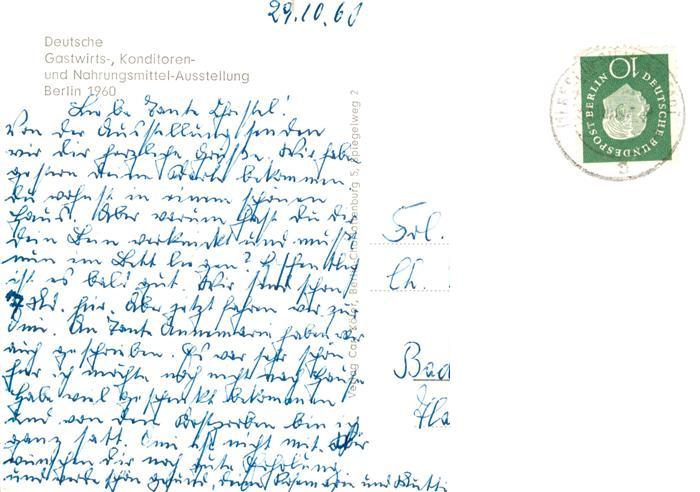 73922277 BERLIN CITY Deutsche Gastwirts Konditoren und Nahrungsmittel Ausstellung Berlin 1960 postalisch gelaufen Erhaltung siehe scans [WerneD78] alte Postkarte Wern Katcode 11110011000000