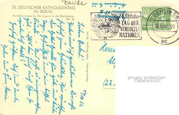 72813763 alte Postkarte BERLIN CITY Deutscher Kathlikentag postalisch gelaufen Erhaltung siehe scans [AndreD76] KatCode: 11110011000000