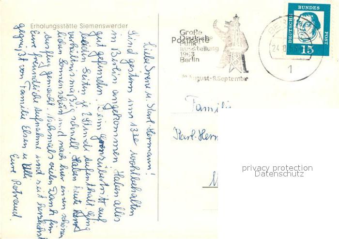 72992269 alte Postkarte BERLIN CITY Erholungsstaette Siemenswerder postalisch gelaufen Erhaltung siehe scans [FriedD77] KatCode: 11110011000000