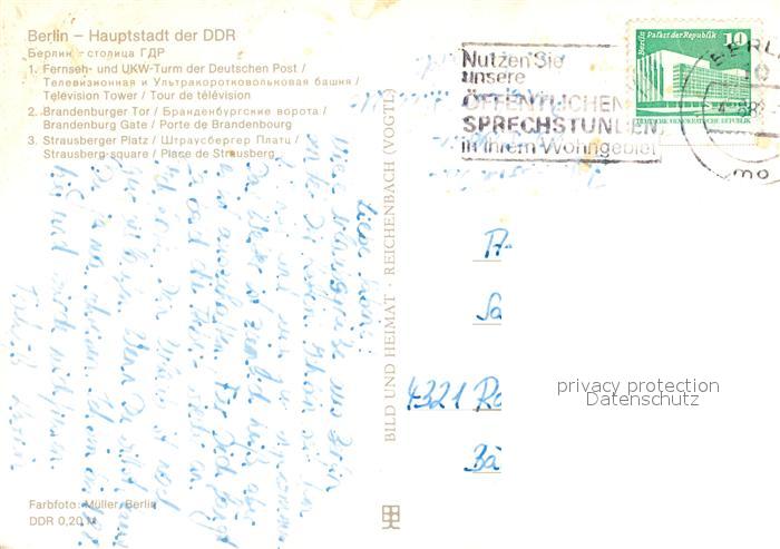73059314 alte Postkarte BERLIN CITY Fernseh und UKW Turm der Dt Post Brandenburger Tor Strausberger Platz postalisch gelaufen Erhaltung siehe scans [WerneD78] KatCode: 11110011000000