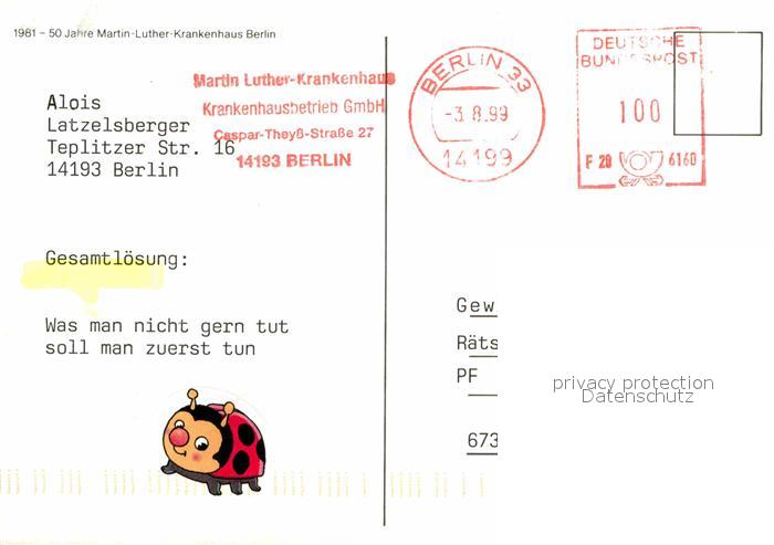 72714485 alte Postkarte BERLIN CITY Fliegeraufnahme 50 Jahre Martin-Luther-Krankenhaus postalisch gelaufen Erhaltung siehe scans [LiesaD40] KatCode: 11110011000000
