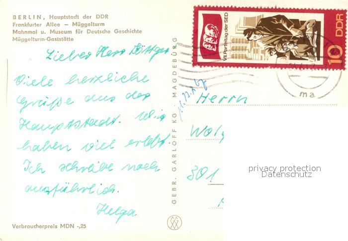 73136867 alte Postkarte BERLIN CITY Frankfurter Allee Mueggelturm Mahnmal Museum Gaststaette Wappen Hauptstadt der DDR postalisch gelaufen Erhaltung siehe scans [FriedD77] KatCode: 11110011000000