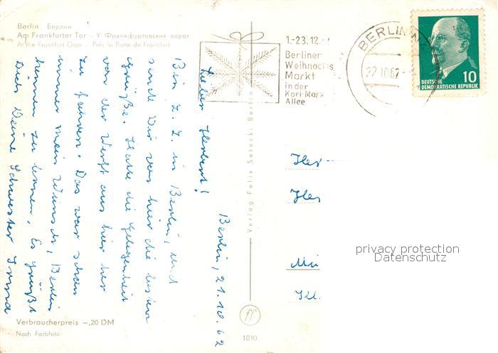 73137881 alte Postkarte BERLIN CITY Frankfurter Tor postalisch gelaufen Erhaltung siehe scans [NatalD47] KatCode: 11110011000000