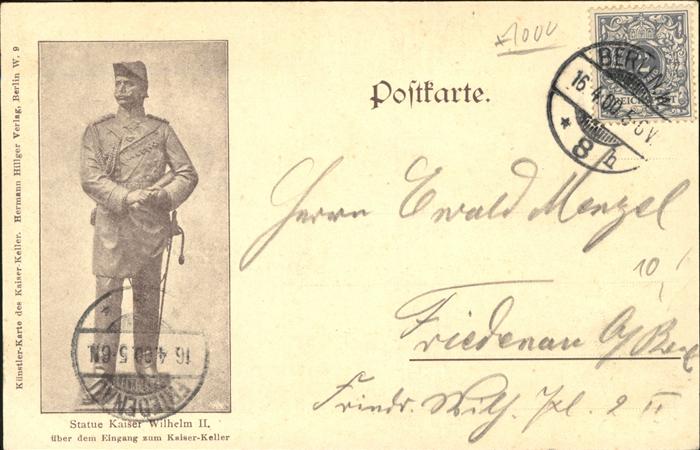 41391956 alte Postkarte BERLIN CITY Gaststaette Kaiser Keller Schiffer Stube Statue Kaiser Wilhelm II Kuenstlerkarte postalisch gelaufen gute Erhaltung KatCode: 11110011000000