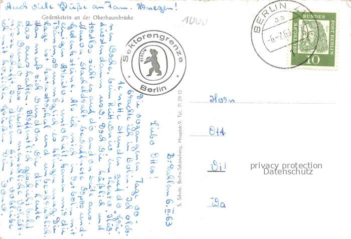 BERLIN CITY Gedenkstein an der Oberbaumbruecke postalisch gelaufen Erhaltung siehe scans [WerneD78] alte Postkarte Wern Katcode 11110011000000