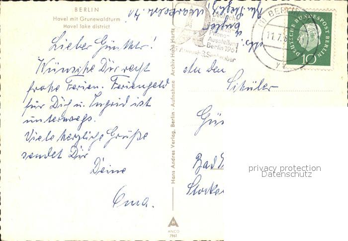 72479417 alte Postkarte BERLIN CITY Havel mit Grunewaldturm Segelboote postalisch gelaufen Erhaltung siehe scans KatCode: 11110011000000