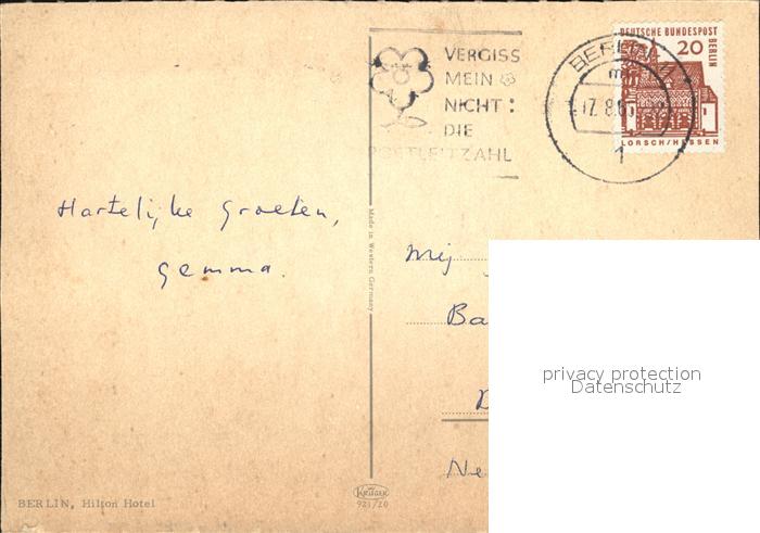 72421416 alte Postkarte BERLIN CITY Hilton Hotel Litfasssaeule postalisch gelaufen Erhaltung siehe scans KatCode: 11110011000000