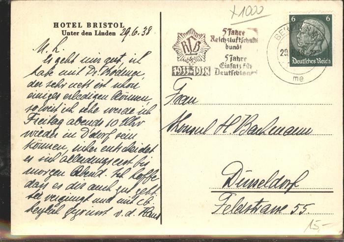 41382530 BERLIN CITY Hote Bristol Unter den Linden postalisch gelaufen gute Erhaltung Alte Ansichtskarte Postkarte alte Postkarte Stef Katcode 11110011000000