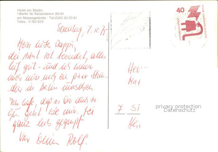 72257799 alte Postkarte BERLIN CITY Hotel am Studio Messegelaende postalisch gelaufen Erhaltung siehe scans KatCode: 11110011000000