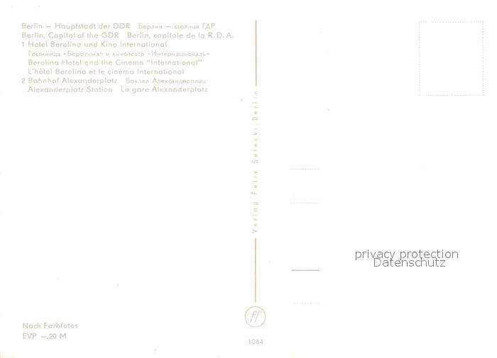 72988008 BERLIN CITY Hotel Berolina Kino International Bahnhof Alexanderplatz Hauptstadt der DDR postalisch nicht gelaufen Erhaltung siehe scans [FriedD77] KatCode: 11110011000000