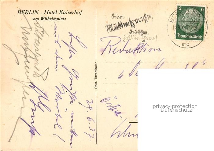 43506526 BERLIN CITY Hotel Kaiserhof Wilhelmplatz postalisch gelaufen Erhaltung siehe scans [KathaD81] alte Postkarte Kath Katcode 11110011000000