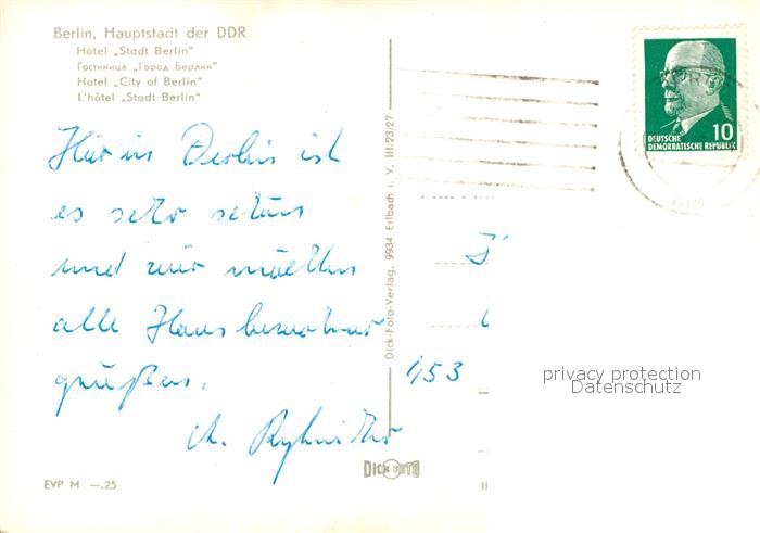 72952594 alte Postkarte BERLIN CITY Hotel Stadt Berlin Hauptstadt der DDR postalisch gelaufen Erhaltung siehe scans [FriedD77] KatCode: 11110011000000