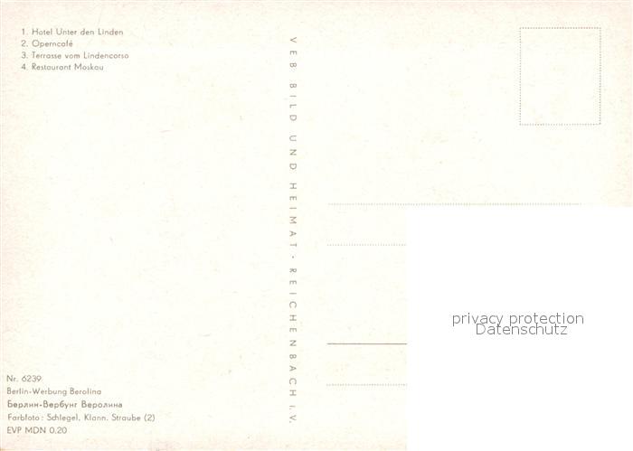 72999410 BERLIN CITY Hotel Unter den Linden Operncafe Terrasse vom Lindencorso Restaurant Moskau postalisch nicht gelaufen Erhaltung siehe scans [WerneD78] KatCode: 11110011000000