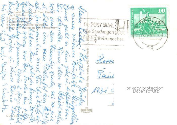 73043715 alte Postkarte BERLIN CITY Interhotel Berlin Brandenburger Tor Neptunbrunnen Palast der Republik Leninplatz Fernsehturm postalisch gelaufen Erhaltung siehe scans [WerneD78] KatCode: 11110011000000