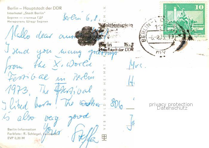 72848916 alte Postkarte BERLIN CITY Interhotel Stadt Berlin Hauptstadt der DDR postalisch gelaufen Erhaltung siehe scans [FriedD77] KatCode: 11110011000000