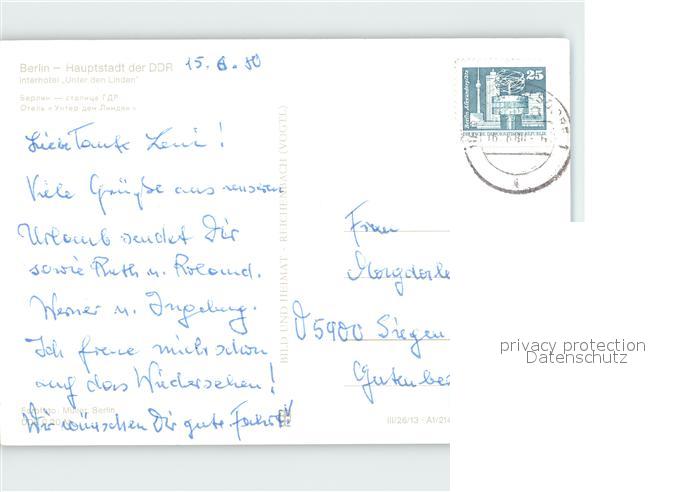 72362095 alte Postkarte BERLIN CITY Interhotel Unter den Linden postalisch gelaufen Erhaltung siehe scans KatCode: 11110011000000