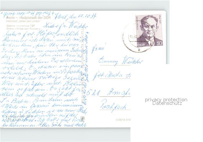 72184905 alte Postkarte BERLIN CITY Interhotel Unter den Linden postalisch gelaufen Erhaltung siehe scans KatCode: 11110011000000