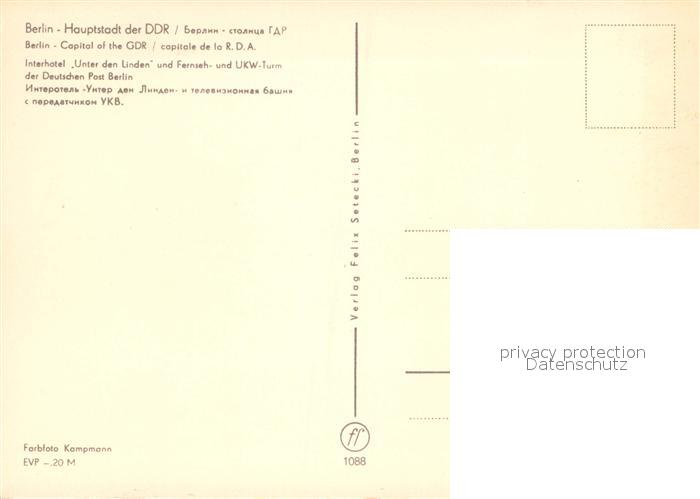 72989843 BERLIN CITY Interhotel Unter den Linden Fernseh und UKW Turm der Dt Post postalisch nicht gelaufen Erhaltung siehe scans [WerneD78] KatCode: 11110011000000