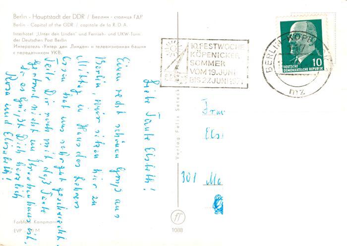 73914835 BERLIN CITY Interhotel Unter den Linden mit Fernseh und UKW Turm postalisch gelaufen Erhaltung siehe scans [WerneD78] alte Postkarte Wern Katcode 11110011000000
