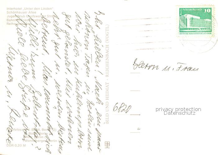 72935138 alte Postkarte BERLIN CITY Interhotel Unter den Linden Sch?nauser-Allee Jugendklub Greifswalderstrasse Bahnhof-Friedrichstrasse postalisch gelaufen Erhaltung siehe scans [LiesaD40] KatCode: 11110011000000