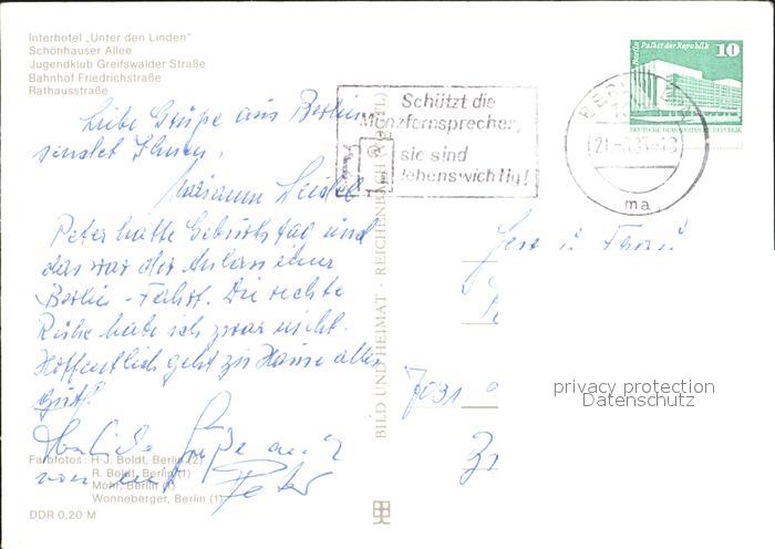 72322957 alte Postkarte BERLIN CITY Interhotel Unter den Linden Schoenhauser-Alee Bahnhof Friedrichstrasse Rathausstrasse postalisch gelaufen Erhaltung siehe scans KatCode: 11110011000000