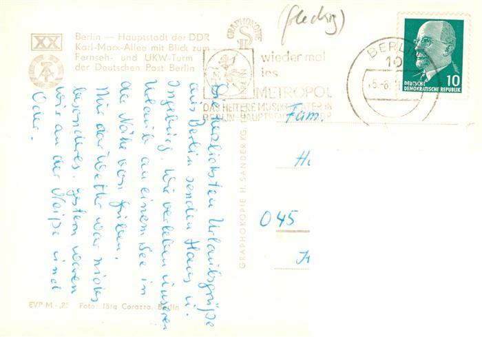 73915167 BERLIN CITY Karl Marx Allee mit Fernseh und UKW Turm postalisch gelaufen Erhaltung siehe scans [WerneD78] alte Postkarte Wern Katcode 11110011000000