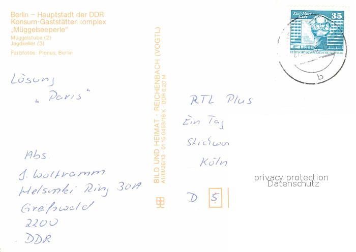 72824254 alte Postkarte BERLIN CITY Konsum Gaststaettenkomplex Mueggelseeperle Jagdtrophaeen postalisch gelaufen Erhaltung siehe scans [FriedD77] KatCode: 11110011000000
