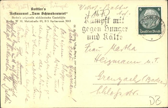 41049427 BERLIN CITY Kottlers Restaurant Schwabenwirt postalisch gelaufen Alte Ansichtskarte Postkarte alte Postkarte Ulri Katcode 11110011000000