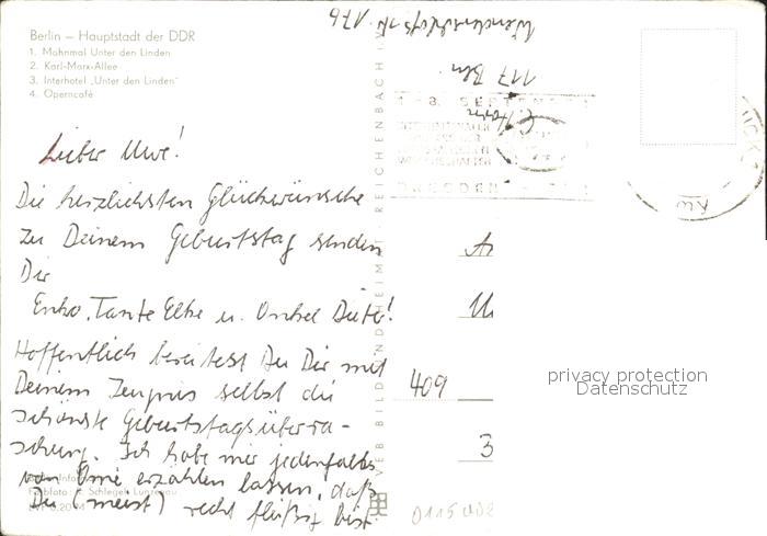 72156634 alte Postkarte BERLIN CITY Mahnmal Unter den Linden Karl Marx Allee Interhotel Unter den Linden Operncafe postalisch gelaufen Erhaltung siehe scans KatCode: 11110011000000