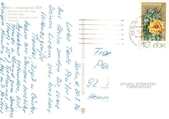 73013823 alte Postkarte BERLIN CITY Mahnmal Unter den Linden Karl Marx Allee Interhotel Unter den Linden Operncafe postalisch gelaufen Erhaltung siehe scans [WerneD78] KatCode: 11110011000000