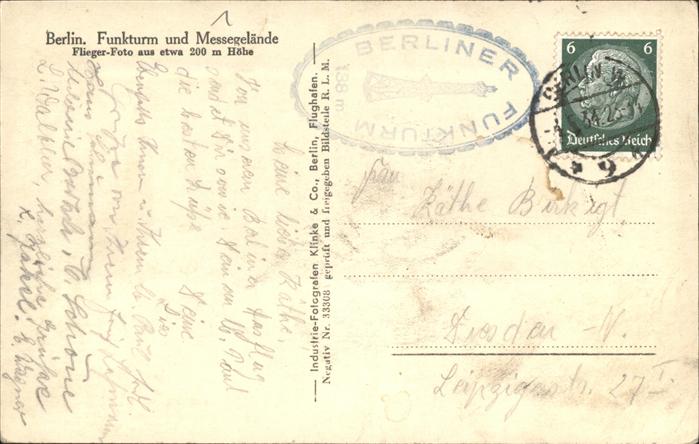 71481727 alte Postkarte BERLIN CITY Messegelaende mit Funkturm Fliegeraufnahme postalisch gelaufen Erhaltung siehe scans KatCode: 11110011000000