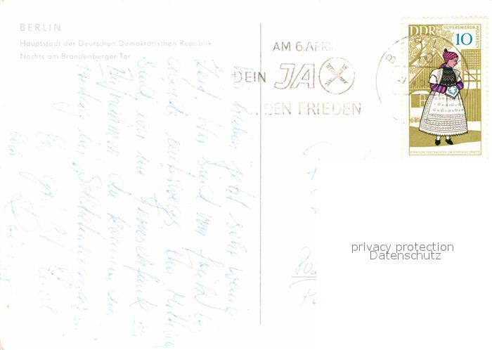 72626501 alte Postkarte BERLIN CITY Nachts am Brandenburger Tor Quadriga Hauptstadt der DDR postalisch gelaufen Erhaltung siehe scans [FriedD77] KatCode: 11110011000000