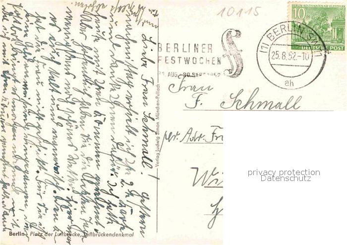 72895791 alte Postkarte BERLIN CITY Platz der Luftbruecke Luftbrueckendenkmal postalisch gelaufen Erhaltung siehe scans [FriedD77] KatCode: 11110011000000