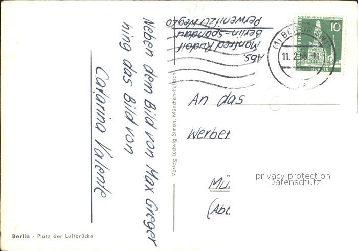 71989614 alte Postkarte BERLIN CITY Platz Luftbruecke postalisch gelaufen Erhaltung siehe scans KatCode: 11110011000000