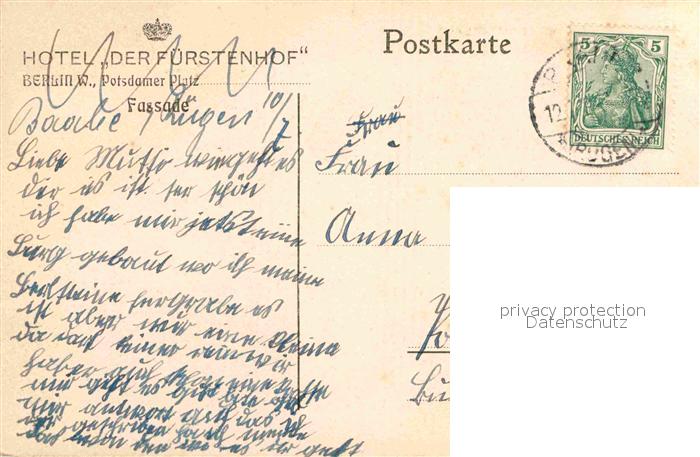 42604328 alte Postkarte BERLIN CITY Potsdamer Platz Hotel Der Fuerstenhof Fassade postalisch gelaufen Erhaltung siehe scans [KathaD79] KatCode: 11110011000000