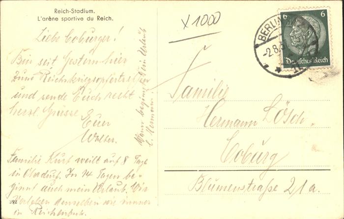 41221354 BERLIN CITY Reich-Stadium postalisch gelaufen gute Erhaltung Alte Ansichtskarte Postkarte alte Postkarte hz_U Katcode 11110011000000