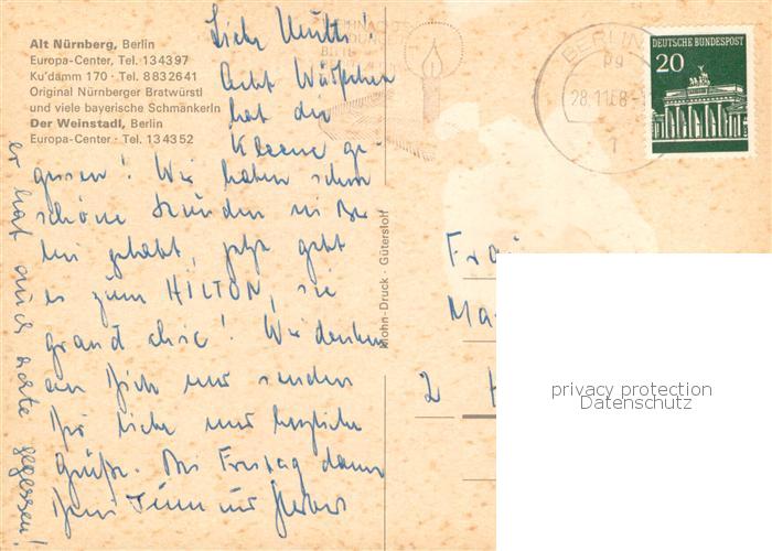 73759177 BERLIN CITY Restaurant-Alt-Nuernberg Europa-Center Kurfuerstendamm postalisch gelaufen Erhaltung siehe scans [LiesaD40] alte Postkarte Lies Katcode 11110011000000
