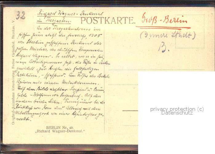 41477112 BERLIN CITY Richard Wagner Denkmal postalisch nicht gelaufen Erhaltung siehe scans Alte Ansichtskarte Postkarte hz_W Katcode 11110011000000