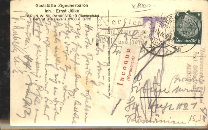 41382489 BERLIN CITY Schoppenstube Gaststaette Ziegeunerbaron Berlin postalisch gelaufen gute Erhaltung Alte Ansichtskarte Postkarte alte Postkarte Stef Katcode 11110011000000