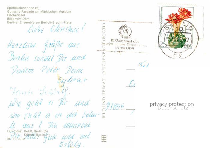 72857410 alte Postkarte BERLIN CITY Spittelkolonnaden Maerkisches Museum Fischerinsel Blick vom Dom Berliner Ensemble Bertold Brecht Platz postalisch gelaufen Erhaltung siehe scans [WerneD78] KatCode: 11110011000000