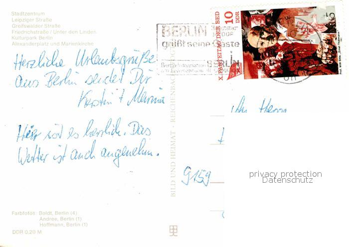 72616771 alte Postkarte BERLIN CITY Stadtzentrum Leipziger Str Greifswalder Str Friedrichstr Unter den Linden Kulturpark Alexanderplatz Marienkirche postalisch gelaufen Erhaltung siehe scans [WerneD78] KatCode: 11110011000000