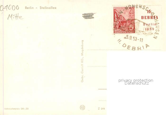 73697230 BERLIN CITY Stalinalle bei Tag und bei Nacht Wappen postalisch gelaufen Erhaltung siehe scans [FriedD77] alte Postkarte Frie Katcode 11110011000000