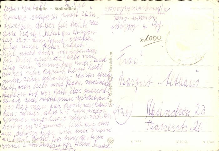 41220731 BERLIN CITY Stalinallee postalisch gelaufen gute Erhaltung Alte Ansichtskarte Postkarte alte Postkarte Chri Katcode 11110011000000